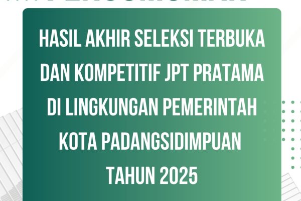 BeritaPengumumanUnduh Pengumuman Hasil Akhir Seleksi Terbuka & Kompetitif JPT Pratama di Lingkungan Pemerintah Kota Padangsidimpuan Tahun 2025 admin2 months ago2 months ago01 mins Read More