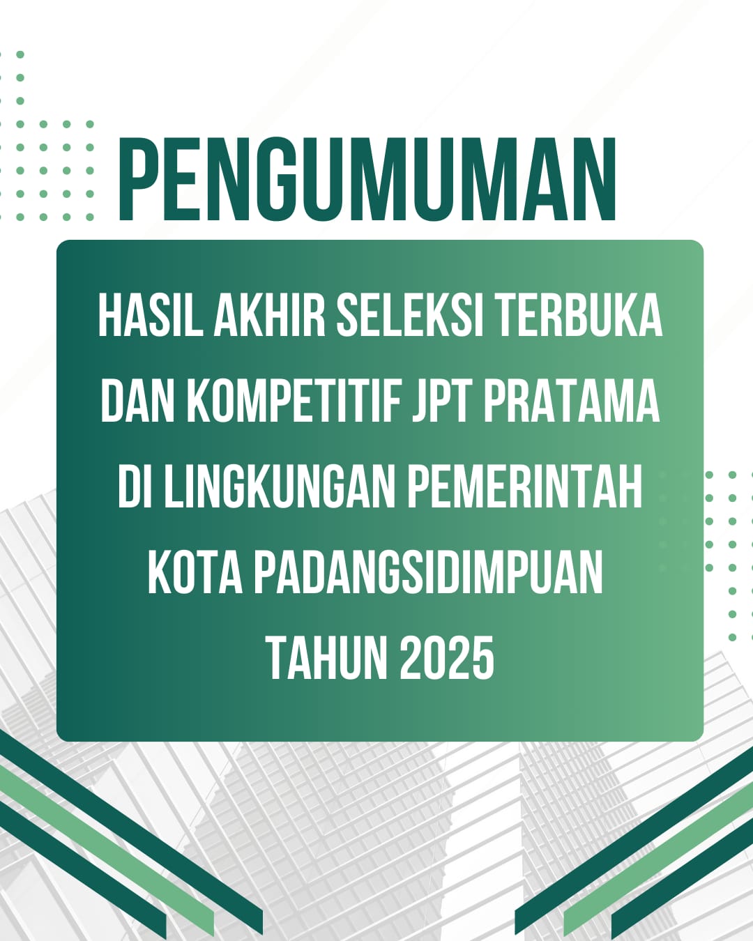 Pengumuman Hasil Akhir Seleksi Terbuka & Kompetitif JPT Pratama di Lingkungan Pemerintah Kota Padangsidimpuan Tahun 2025 admin2 months ago2 months ago 0